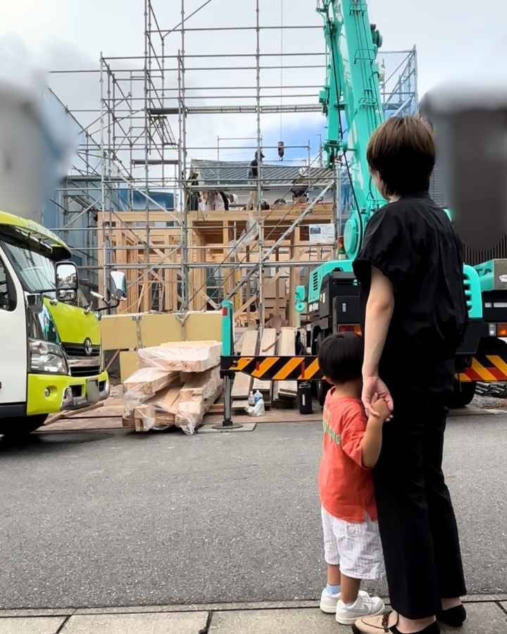 目の前で建てられていく我が家を、愛おしそうに見つめるお施主さまと、かわいいお子さま。その姿からは、これから始まるマイホームでのあたたかな暮らしへの、まっすぐな期待が伝わってきます。