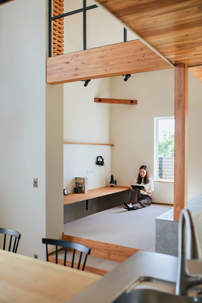 家族の生活時間がずれることが多いと最初のヒアリングを通してお伺いしました。家の形をL型にすることで主寝室をLDKから離し、生活音が気になりにくいような間取りにしています。